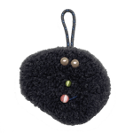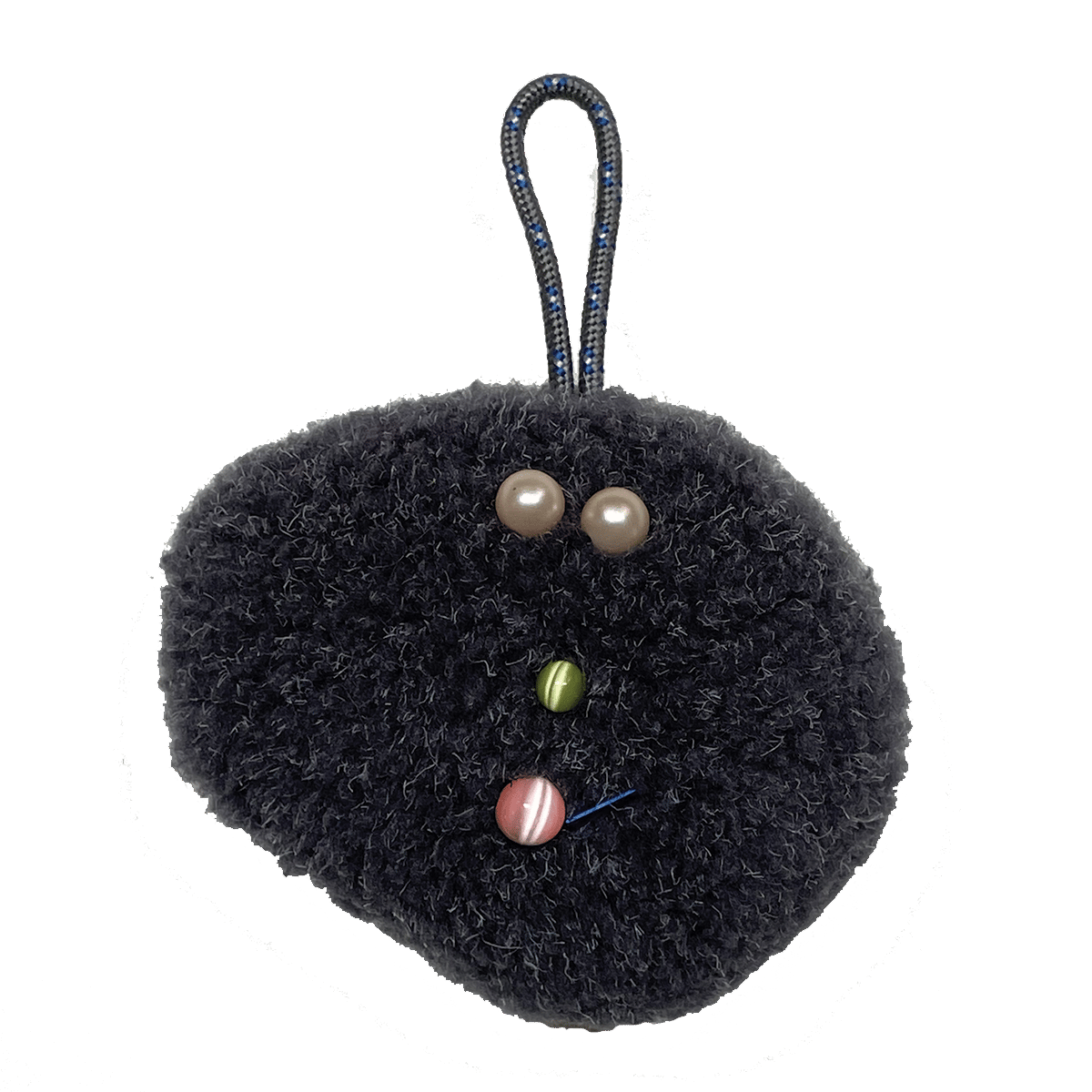 hand sewn, made with: dark gray fleece fabric, vintage cats-eye glass & plastic beads, braided nylon rope