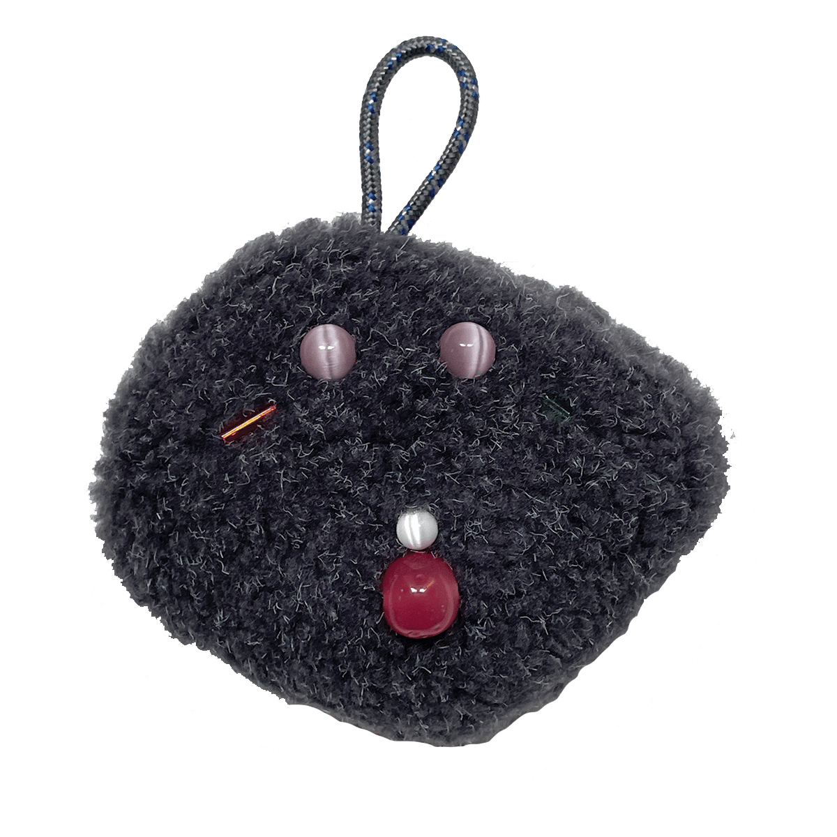hand sewn, made with: dark gray fleece fabric, vintage cats-eye glass & plastic beads, braided nylon rope