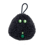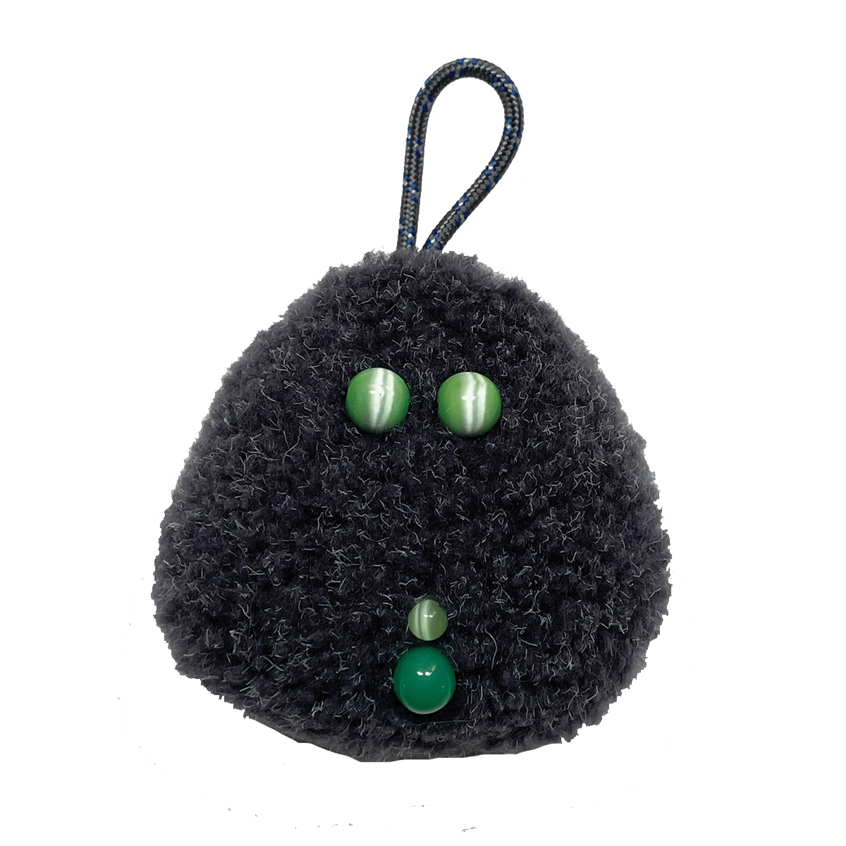 hand sewn, made with: dark gray fleece fabric, vintage cats-eye glass & plastic beads, braided nylon rope