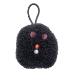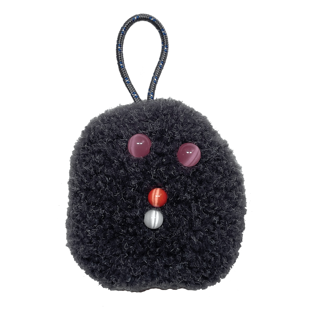hand sewn, made with: dark gray fleece fabric, vintage cats-eye glass beads, braided nylon rope