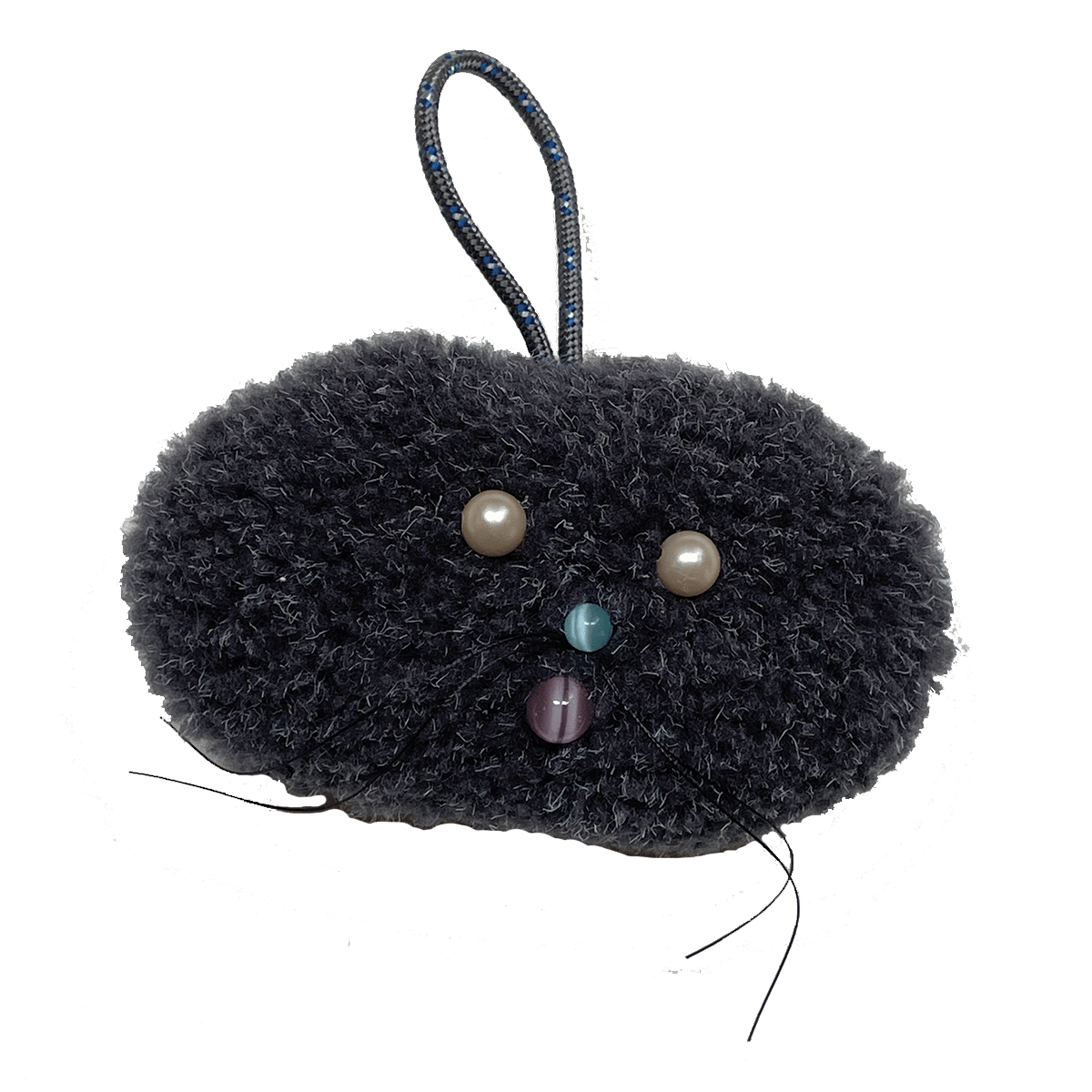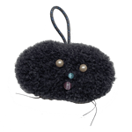 hand sewn, made with: dark gray fleece fabric, vintage cats-eye glass & plastic beads, upholstery thread, braided nylon rope